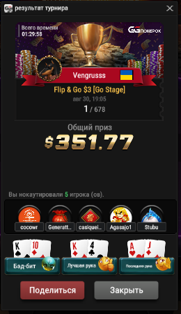 Затем я запустил подарочный Flip`n`Go за $3. И, о чудо, прорвавшись через 650+ человек в оллинах с минимальным начальным стеком - попал в топ 28 и, соответственно, в итм.
