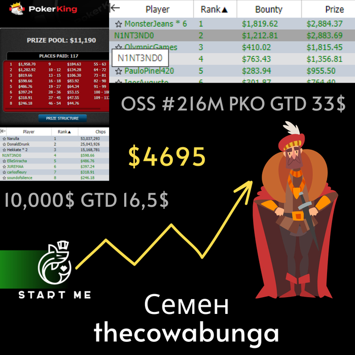- Семен | thecowabunga: $1,053 - PKO $33 (PokerKing, 1/141)
