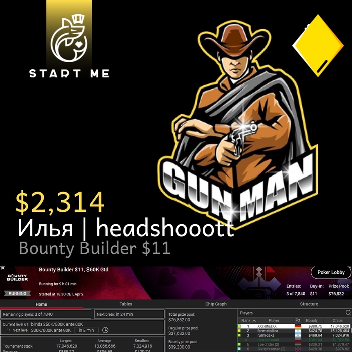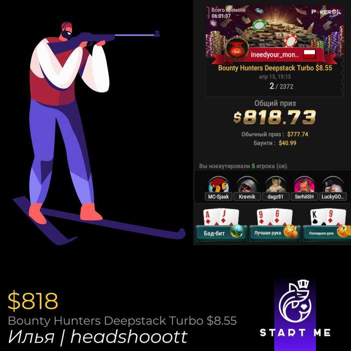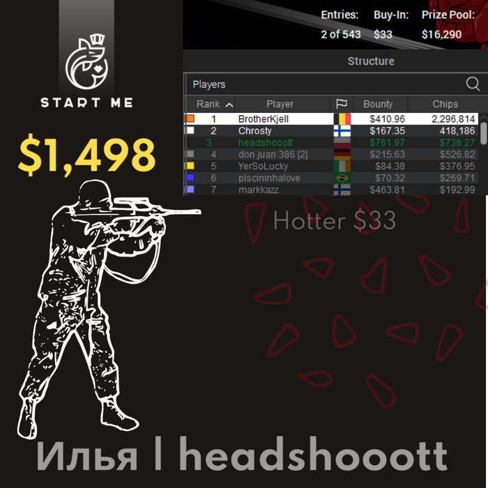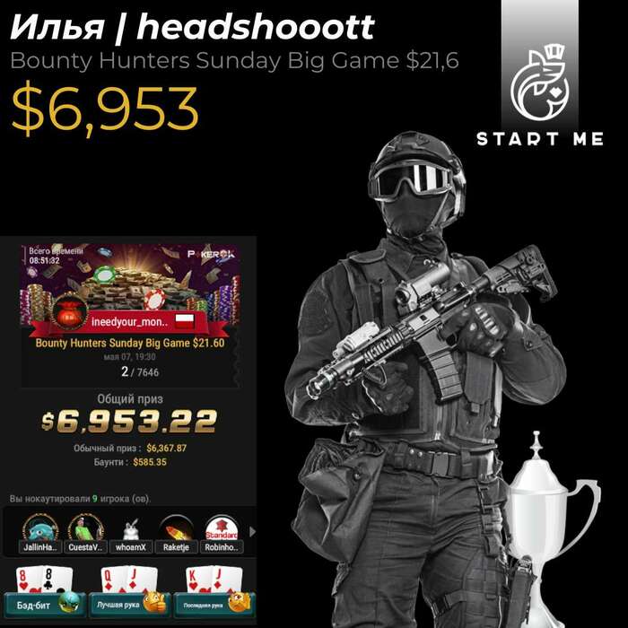 🥈 Илья | headshooott: $6,953 - Bounty Hunters Sunday Big Game $21,6 (GGPokerok, 2/5912)