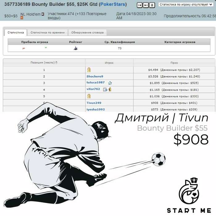 - Дмитрий | Tivun: $757 - Bounty Builder $16,5 [Satruday Special] (PokerStars, 4/1396)