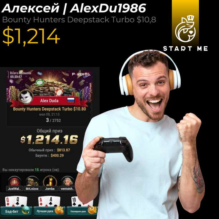 - Алексей | AlexDu1986: $1,214 - Bounty Hunters Deepstack Turbo $10,8 (GGPokerok, 3/2264)