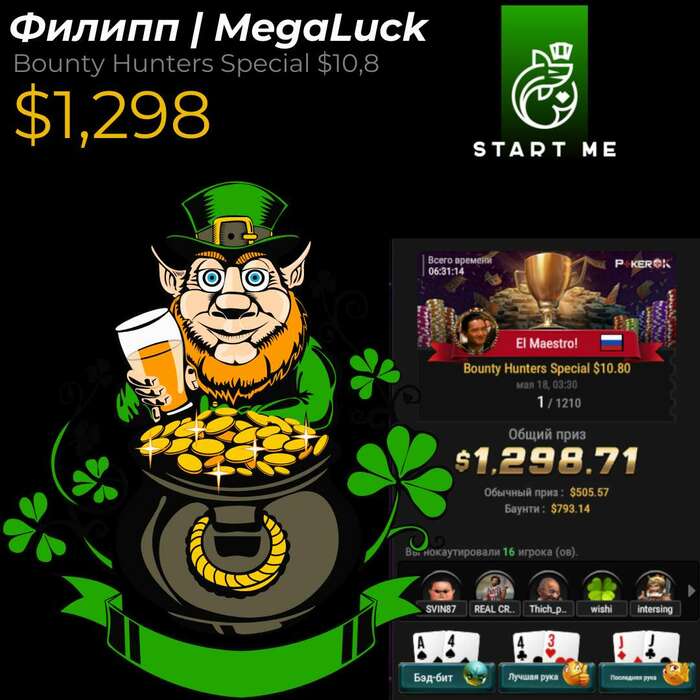 🥉 Филипп | MegaLuck: $1,298 - Bounty Hunters Special $10,8 (GGPokerok, 1/881)