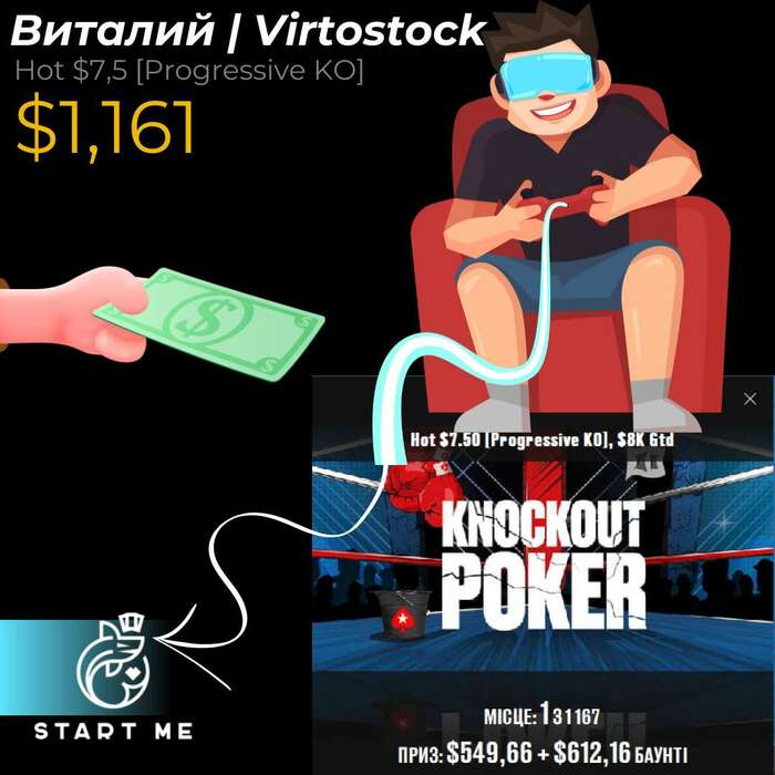 - Виталий | Virtostock: $1,161 - Hot $7,5 (PokerStars, 1/1035)
