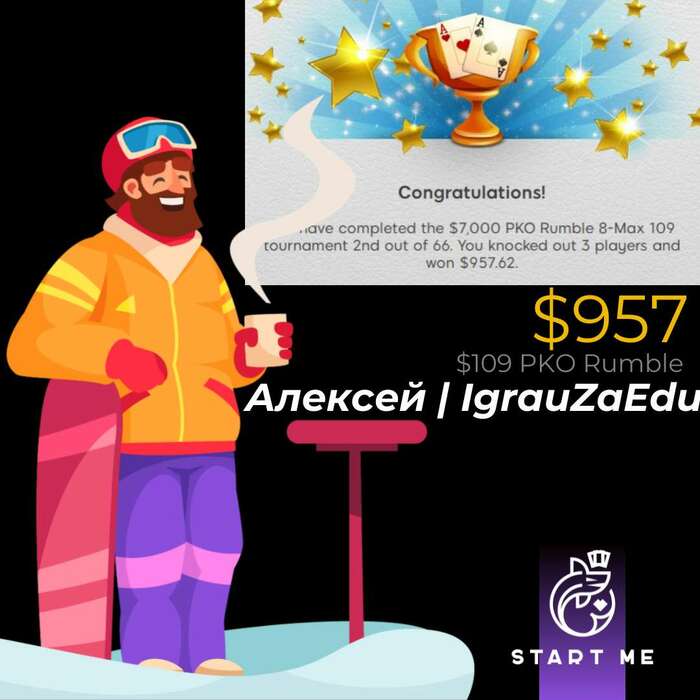- Алексей | IgrauZaEdu: $957 - $109 PKO Rumble (888poker, 2/66)