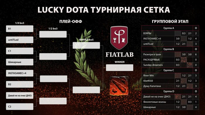 Устроили в FiatLab праздник доты. Я придумал не скучный формат, а весёлый, где ощутим фактор случайности.