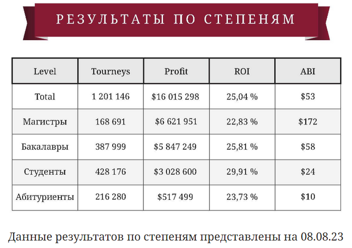 Давай посчитаем, пусть магистр играет 300 турниров в месяц (это ленивый режим,прямо скажем). 300*172$ *0,22(ROI) = $11352 . Почти все вкладывают от себя, получают 75 процентов от этого. Итого $11352 * 0,75= $8514 в месяц у магистра по ожиданию себе в карман.