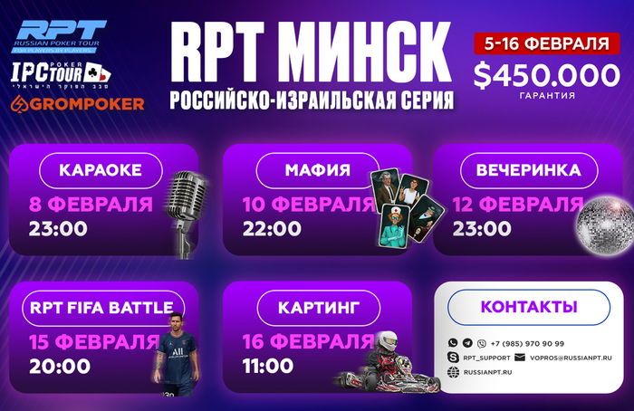 В планах на февральский этап традиционные RPT Party и караоке-баттл (без них никуда), также поиграем в мафию, посоревнуемся на джойстиках и выявим лучшего в турнире по FiFa, ну а в заключительный день серии устроим чемпионат по картингу. Неплохо?))