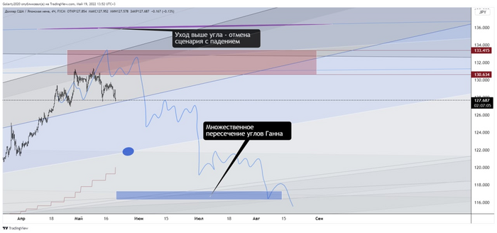 Свои короткие позиции я планирую держать до синего уровня, где сплетаются несколько углов Ганна ~117-118. Частичные фиксации имеет смысл рассматривать от ~122.000.