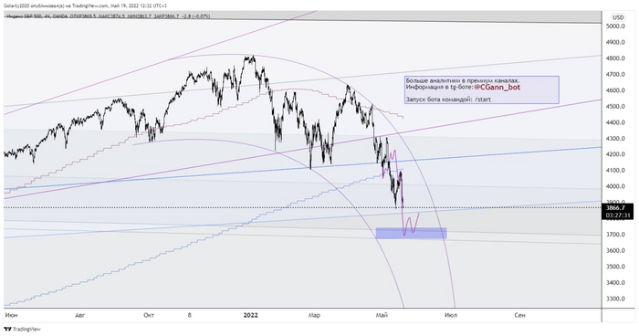 Индекс SP500 показывает в моменте 20% снижение от своих максимальных значений. По нашей торговой системе ему нужно упасть еще на 3-5% в целевую синюю зону. После этого, на мировых рынках можем ожидать небольшую оттепель - коррекцию вверх.