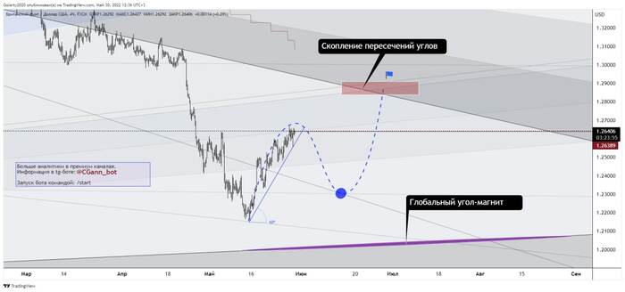 Фунт до середины мая развивал нисходящее движение, как и было предположено месяцем ранее. В рамках текущей коррекции, вероятная её цель располагается на уровне пересечений углов ~ 1.28700.