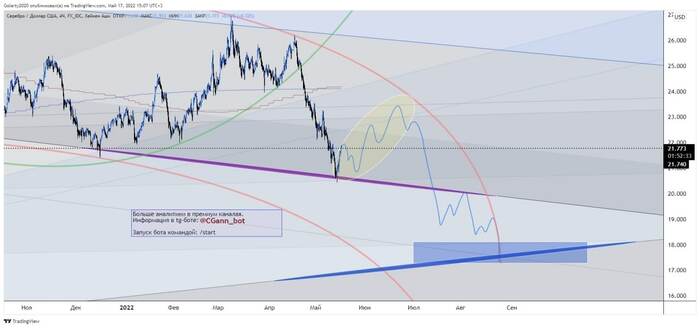 Технически: Цена в 20-х числах апреля сломала восходящую параболу и пробила красный угол. Это означает, что приоритет по вероятности смещен в сторону снижения к фиолетовому углу. Локально, возможно, мы увидим откат вверх в зону 23.4 - 24.1, после чего продолжение падения цены металла.