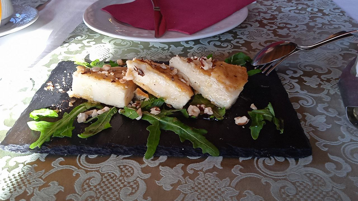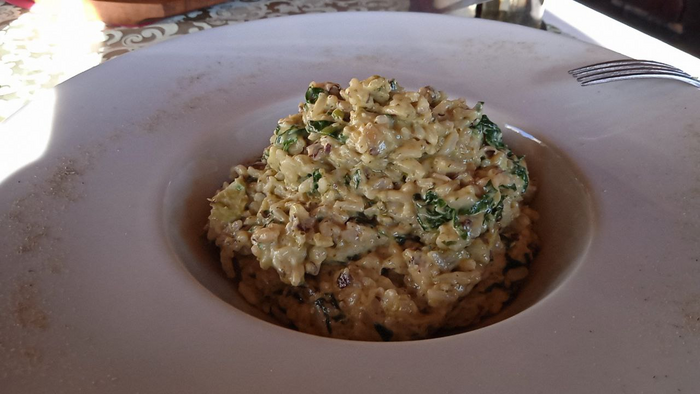 Запеченный козий сыр с медом и фундуком, ризотто с песто и шпинатом