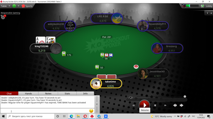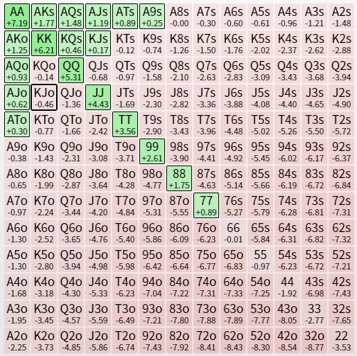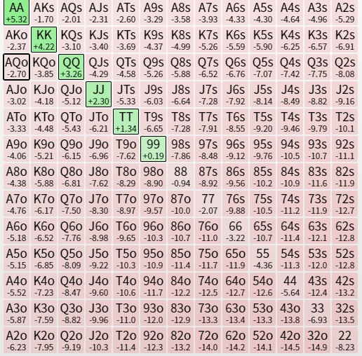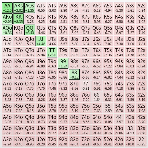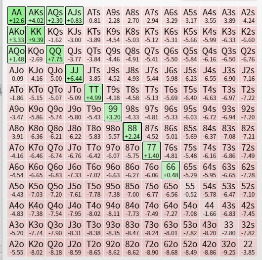 КВ против 86% пуша с кнопки. Ну тут надо понимать, что кальк считает так будто хенд закончится и поделят по айсиэм, тогда как в реальной жизни чипак чипак будет пушить почти все, второй стек фолдить почти все, а наш стек жрать блайнды. И насколько сильно допустимо отклоняться от значений калька никто не знает)