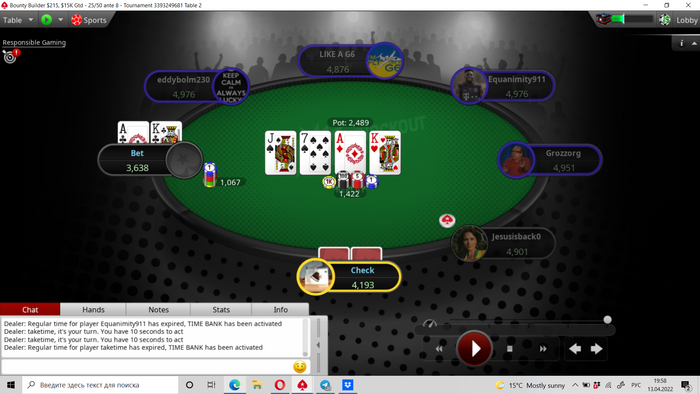 П.П.С. В игре, я нажал колл с 88, фолд с АД и колл с КВ.
