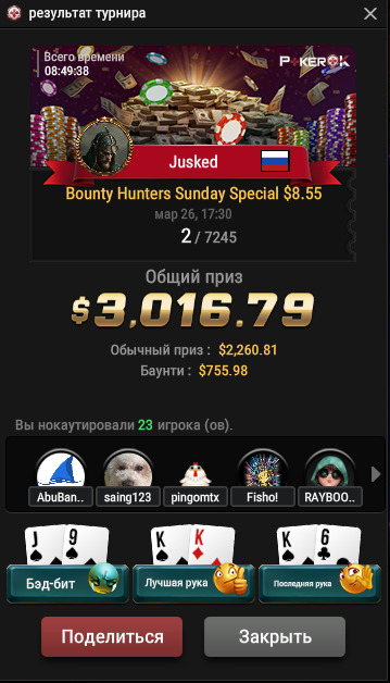 Сегодня решил перезагрузить мозги, посмотрел винрейты и понял что в начальной стадии турнира я царь и бог, а вот ближе к дипам играл агрессивнее, чем нужно было, от чего часто выставлялся снизу и справедливо вылетал с копейками в кармане. Перешел на тайтовую сторону игры в дипах.