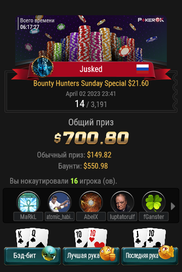 Это воскресенье запомнилось обидным вылетом на 50ом месте из 10к тел! Давно я такие килополя не играл, от того вдвойне досаднее. Отбил 10бб на бб против пуша чипака с баттона, в итоге KJo < Q6o.