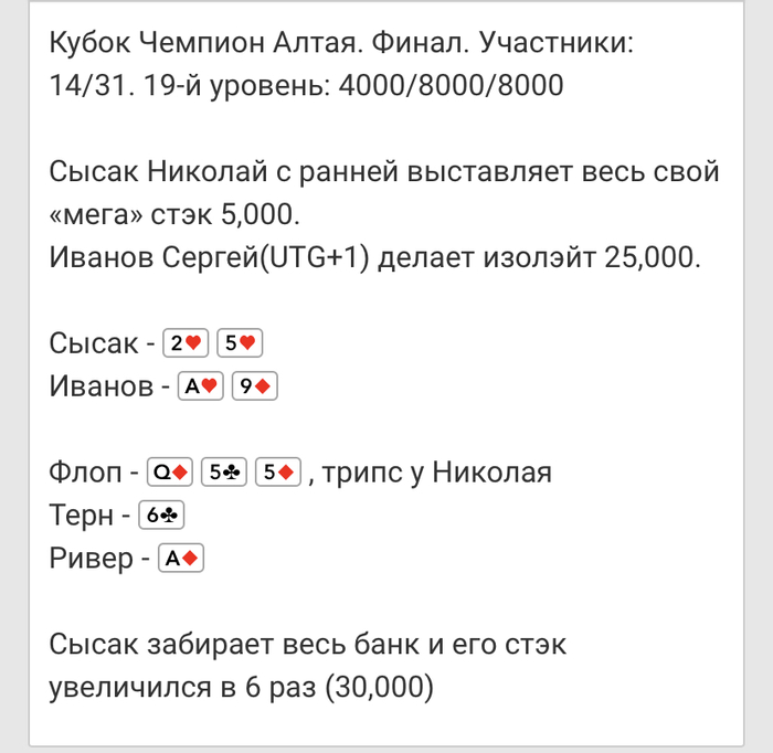 Ривер - , Иван чек, Артем чек- олл-ин остатком стэка 18,800. Иван не стал рисковать и скинул карты