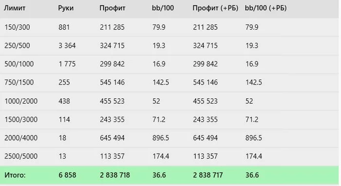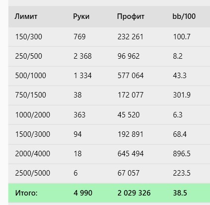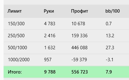 Подведем промежуточные итоги покерного года. Я наконец то стал вести стату по лимитам поэтому все будет наглядно. Правда омаху забывал указывать, здесь ее процентов 10 от силы.