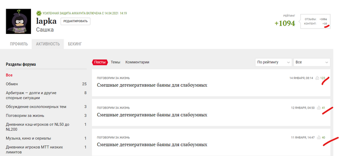 В общем вот. Эксперимент не повторять, ± в арбитраже, юморке, СДБДС и прочих темах-разделах не учитываются, насколько я понял только в блогах.