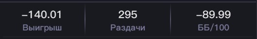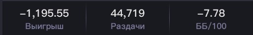 Отыграл почти 55к раздач в приложениях, на лимитах эквивалентных нл25$ и нл50$. По началу плюсовал 3-4 недели, потом минусанулся и поехало. Занимаюсь в солвере, но результаты пока вот такие (это в рублях, нужно еще умножать на 100)