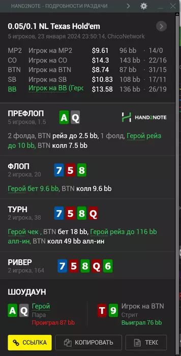 Следующая рука - короли. Плюс полстека. Ещё следующая рука - тузы, сет, ещё чуть. Потом дамы, я рейз, адский нит 3бет, я кол, сет дам на пустом флопе. Эффективный стек 200бб примерно. Ставит полбанка, я кол. Терном король, он чек и тут я реально испугалась, чек/рейза, там запросто могут доехать короли, так как диапазон очень узкий. Я чек. Ривером бланк, чек-чек. Там AQo. Тут поняла, что уже сплю с открытыми глазами практически, и закрыла клиента. Сегодня надо будет попробовать повторить этот спот, начиная с прогулки. Посмотрим.