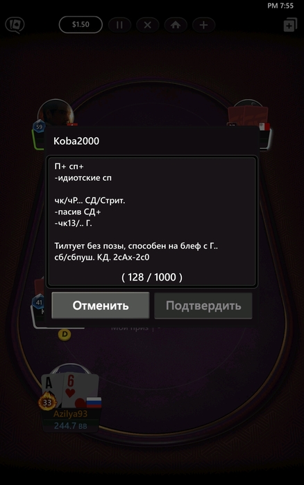 Последние десять дней выдались уж слишком суровыми, пару дней рождений, какие-то тусовки, на которые я по какой-то причине обязан был пойти, хотя будь я немного целеустремленнее, то уж точно бы пару из них проигнорировал, придумав необходимые оправдания. Из-за этого, само собой толком не играл, от чего сегодня довольно тяжело катать, после уже отыгранных 1к рук. Сколько раз можно наступать на одни и те же грабли, я не знаю. Вроде бы поставил для себя цель (побить НЛ50), да и алкоголь уже давно не приносит того удовольствия, ради которого он употреблялся, не говоря уже о 2-3 дневном похмелье. Но ныть уж точно не выход, поэтому в который раз себе говорю, что пора высунуть голову из задницы и перестать быть мудаком!