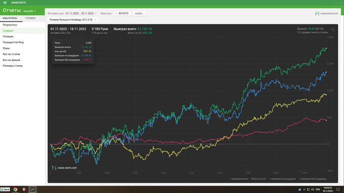 Сегодня поляна вроде бы неплоха, новые лица, с жутким обезьяним характером и рандомными прожатиями по кнопке кола, игры было куча, в определенные моменты даже не знал какой из столов закрыть. Ниже график, пока только с ГГ, лень на х2н сбрасывать, да и хочется хотя бы 15-20к рук прежде откатать и лишь потом более подробный отчет сбросить.