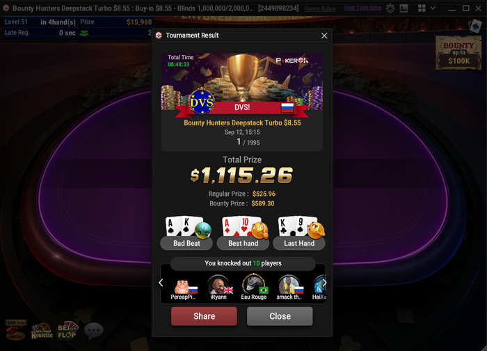 В сентябре начал катать турниры-исключения в лучшие дни (а для низких и средних лимитов это пт-сб) и спокойно грузил ноки за 22 и 25 бачей. Скажу, что поляна не показалась непроходимой и сильного отличия от турниров за $5 не увидел. Мой хороший знакомый Макс Юровских из другого фонда регулярно катает турики до 50 и советует не париться, а просто концентрироваться на своих решениях. Ну и тренер уже в моём фонде говорит, что еблом по клаве катаются как в однодоллоравых турах, так и в пятидесятипятидоллоравых 😝