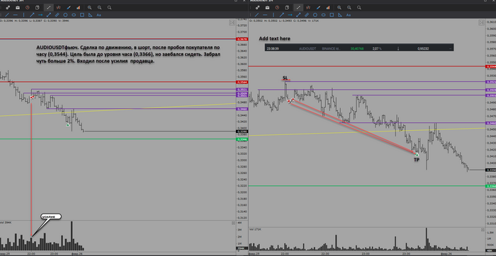 AUDIOUSDTфьюч. сделка по движению, внутри часа по м5-м1 (по итогу все-таки дошла до цели 0,3366)
