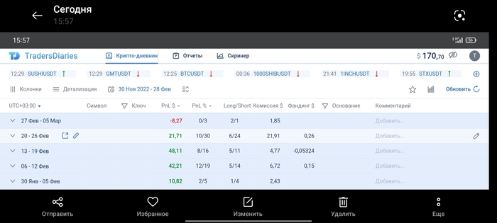 Результат за февраль: +120$. Для многих покеристов это "сраные копейки", которые могут улететь за одну раздачу или за оплату блайнда. Но это суровые реалии для тех кто думает, что пришел в трейдинг и будет зарабатывать хулиарды миллионов денег не вкладывая почти ни гроша. Кручусь в очередной раз с 50 стартовых долларов. Дойдя до цели научусь ценить свой банкрол, который будет выстроен с этих копеек. Да осилит дорогу идущий!💪😎 Всем мир, парни!