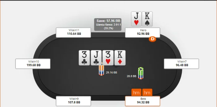 2. Зачем оппу ставить бет пот по второй паре, если у бтн диапазон выглядит посимпатичнее?)