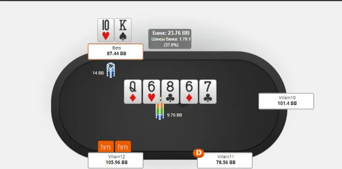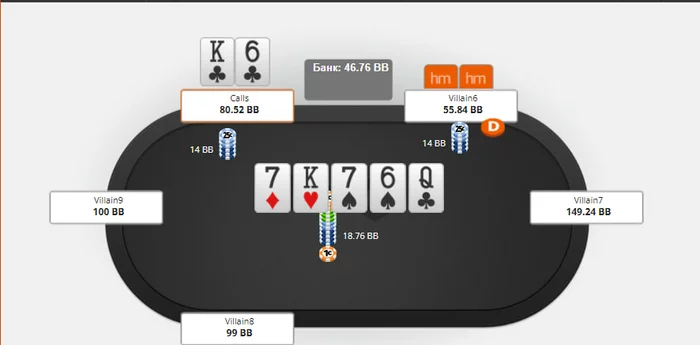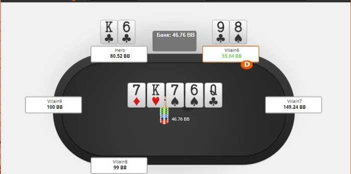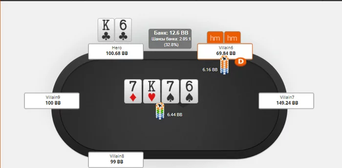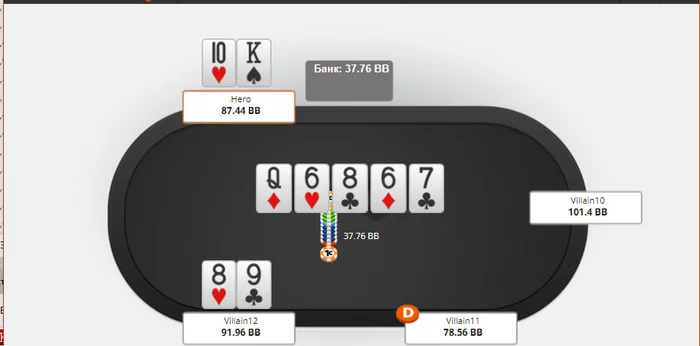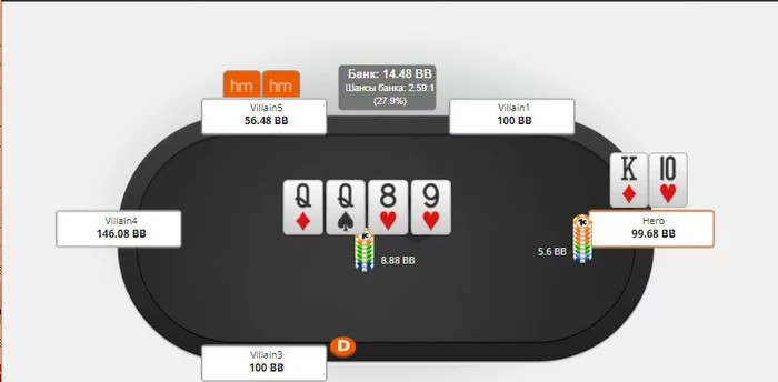 отличный ривер и мы чек-колим сайз в 80% не блоча ни один из блефов, оч много всего промахнулось очевидно
