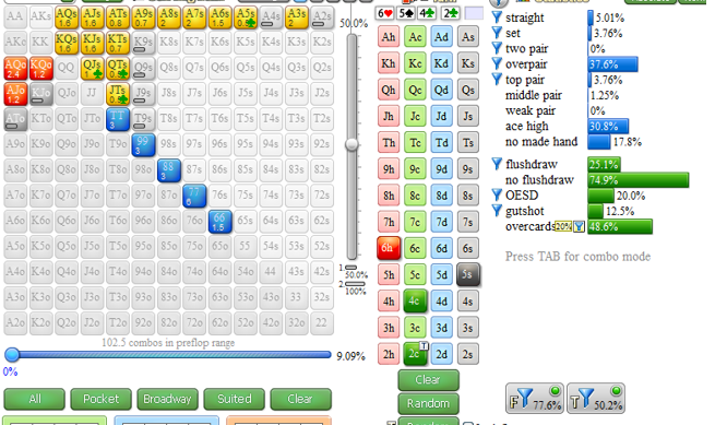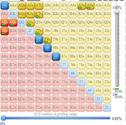 Дело не только в диапазоне, дело ещё в том, как какие типы рук он будет играть. И вот, допустим, с тузами он сыграет так же 10 раз из 10, а вот с AQs он так сыграет не со 100% частотой.