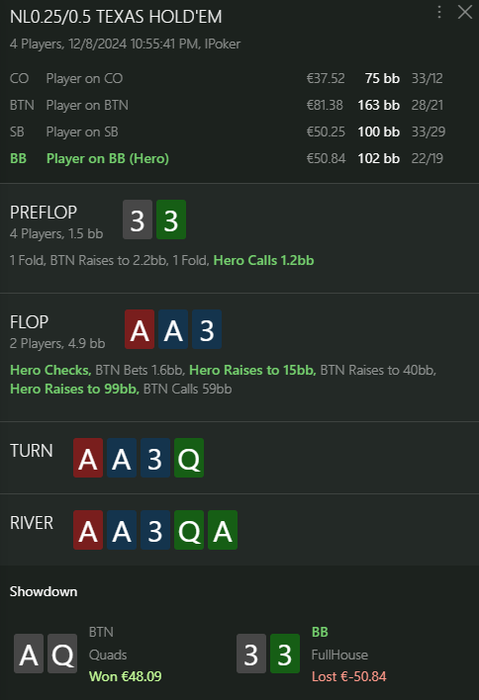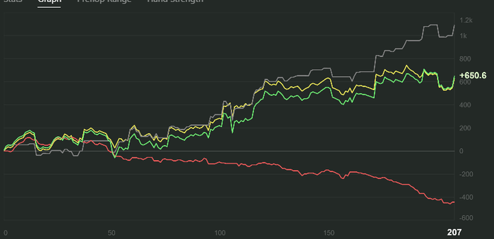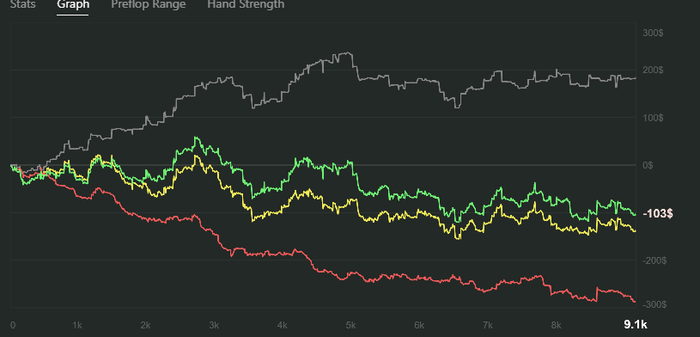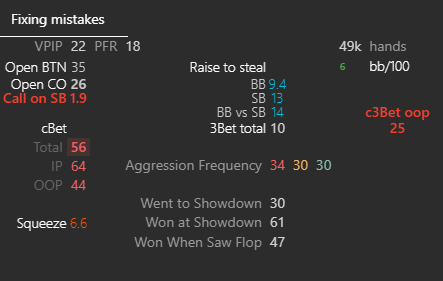 Страта префлоп не поправилась, все тот же недоопен с БТ и СО. Лимпы на СБ остались, просто я теперь их делаю осознано. За-то постфлоп играю прилично лучше чем раньше.