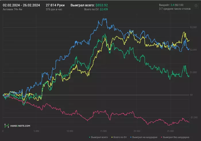 В этом месяце скатал чуть больше 20к рук на полтосе с двузначным винрейтом) что вместе с рб принесло примерно 1750$. Неплохая прибавка) Да, я чувствовал что большое количество столов сказывается на концентрации и внимании. Но таков путь) Все косяки уже включены в винрейт 8/100. И пусть лучше будет 600 рук/час и 8бб/100. Чем 12бб/100 и 300 рук/час. Понятно что стриковать может жестче при меньшем винрейте, но дистанция в 2 раза больше и рейкбек соответственно, должны перекрыть все это дело. Короче, мне нравится то что я сейчас делаю. Сел и полностью погрузившись в игру фигачишь 3 часа. Потом перерыв. И снова так же. В идеале было бы нажал кнопку, тебе выпали 9 столов. И ты играешь их. Хотя зум уже придумали, ну его нахуй))) поэтому селект + мультитейблинг.