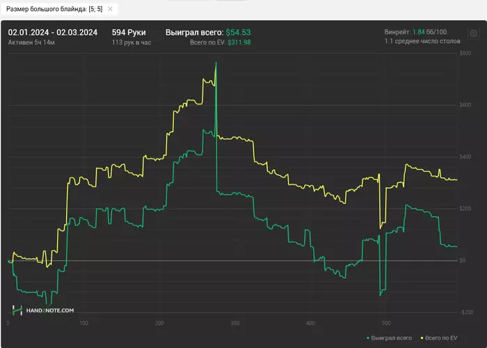 Что касается нл200. Последнюю раздачу в этом месяце отыграл 18 марта. Потом решил отказаться от этого лимита временно. Я понимаю что я его бью на дистанции. И показываю там винрейт 5,2/100 по факту и 7,7/100 по ев.