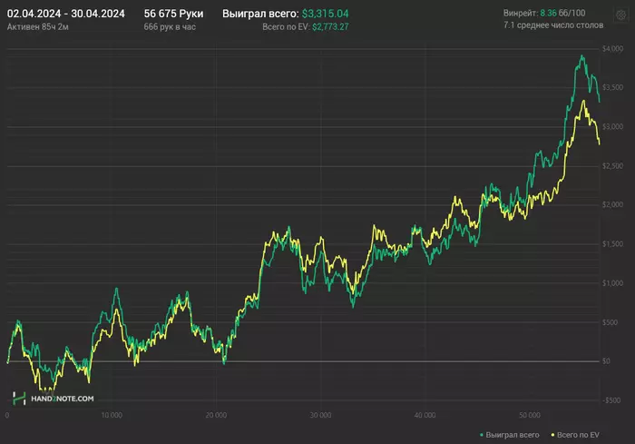 Зато по дистанции нельзя сказать что ленился) Потому что всего на 4к рук меньше, чем в марте. А там я отыграл 115 часов за столами. Цель по подъему количества рук/час выполнил. На май такой задачи нет. Примерно сохранить те объемы которые есть сейчас.