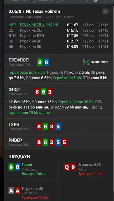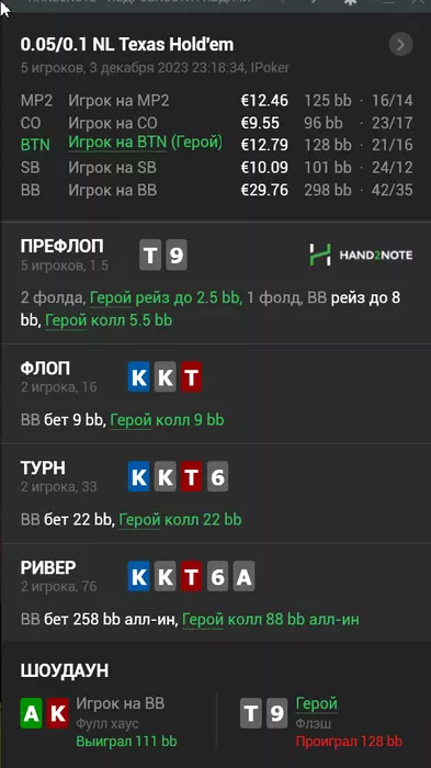 Дальше складывалось так себе...Вот тут очень сложный спот оказался,опп с большой агрой и законченной линией блефов,показалось,что стрит у него там тоже есть в пуше + все К без фуллов,но увы...