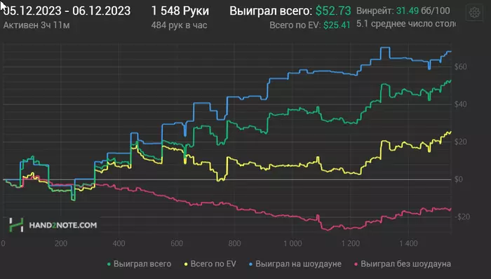 Хорошая сессия,спокойно и планомерно наращивал + ,во флипах везло,да и пару хороших блефов на стек вскрыл.