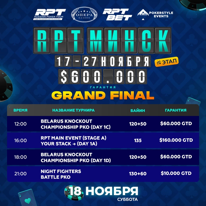 В 18:00 старт $170 BELARUS KNOCKOUT CHAMPIONSHIP (day 1D) (GTD $60 000). Последний флайт с уровнями по 20 минут. Стартовый нокаут $50.