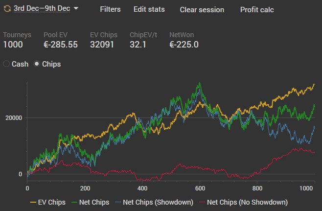 Как обычно, хотелось бы лучше, но уж как получилось. Зато удалось попасть в лб на 3 место на 100 евро и разок на 25 евро, и за сегодня тоже должно капнуть минимум 100, а может и до 1 места дотянусь. Самое главное для меня, что при переходе на постоянные 5 столов уже 4 неделю, ев не проседает, время экономится, а значит евро/час растет.