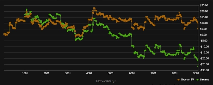 А так как ты хотел играя по 9000тыс раздач в день... это часов 12-14 а за такое время можно и банкролл слить если не контролировать ситуацию.