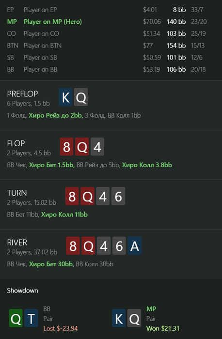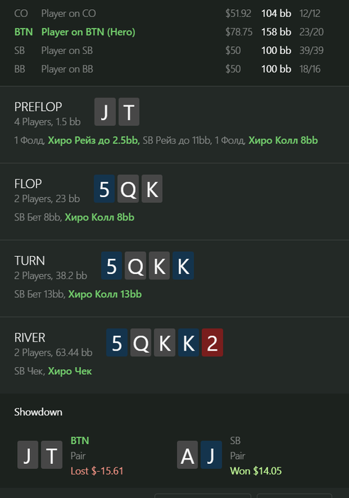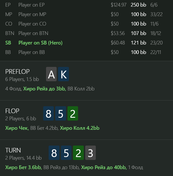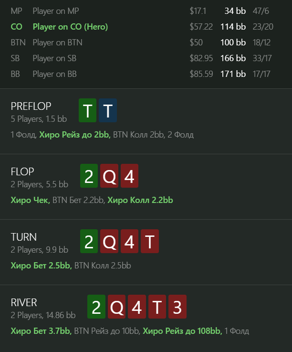 loolal1ve, На самом деле я тоже думал, что не лучшая. У нас тут 6 комб велью, но оппоненту довольно тяжело даже чуть меньше половины диапазона защищать (где-то 18 %RFI я взял, чтобы KJo и часть K9s попали), при этом еще и руки типа QJ пиковые, чтобы не оверфолдить.
