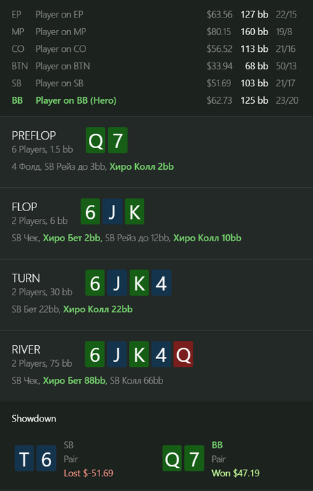 опп на ривире снепнул, магия спарки, интересно, что на его месте лучше колить 66 или AQ, солвер всегда фолдит AQ и иногда колит 66, для меня это не совсем очевидно, понятно что 66 не блочит блефы, но я бы считал, что основные блефы это JTs, а так AQ еще велью блочит