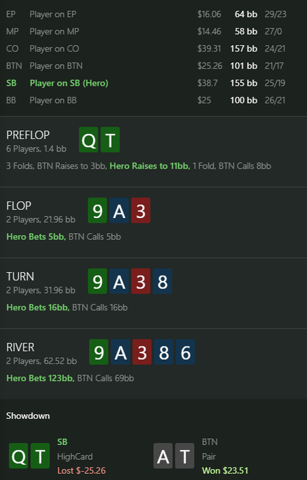 Но, ведь рука была выбрана именно AQo, а не 72o. Значит действие было сделано не с целью выебать, а потому что показалось, что по блокерам пролезает.