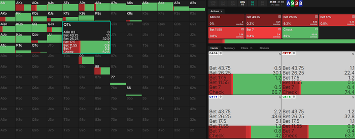 GTOBase OOP не имеет QJo/QTo, поэтому IP предпочитает рейзить AJ vs 1/3, зато на 2/3 частично бросает AJ, но колит все AT.