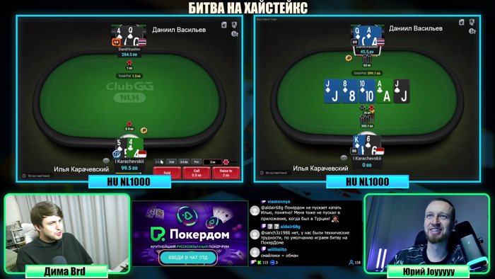 Август получился отпускной и практически полностью выпал из катки. Из событий с Димой Brdz освещали мой любимый формат - битва на хайстейкс Heads-up матч Илья KARACHEVSKII vs Даниил Васильев на нл1к. Илья и Даниил выдали самый зрелищный матч на данный момент в этой серии трансляций.