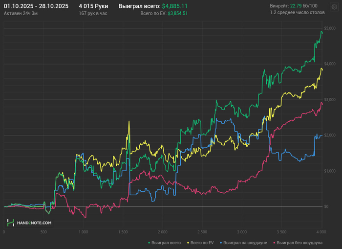 Вначале месяца пошёл тестить два новых браузерных рума. Один оказался шляпой с хаус ботами, просто 24/7 игрались все мидстейкс лимиты до нл1к и всегда сидело 3-4 игрока за столом в любое время суток на каждом лимите. Боты притворялись фишами, лимпили, создавали иллюзию нормальной игры. Будьте аккуратны. Этот рум скипнул сразу после первой сессии. Второй поинтереснее т.к. про него до теста слышал позитивный фидбек. Неделю наблюдал, что происходит и в одну из сессий подобрался подходящий сетап для врыва. Играл нл400 с американским регом и фишом в 3максе, ещё и в позе на фиша. Но из за того , что они оба играли ультра агрессивно, видимо деньги не давили совсем на обоих, попал под каток между двух маньяков. Как только заходила рука у оппов была рука чуть сильнее, за пару часов только 1 банк выйграл остальные проиграл. Плюс там много неудобств по софту, которые конкретно в этом руме реально высасывуют ресурс и усталость быстро накапливается. По итогу, чуть подзалил в этих экспериментах и решил взять паузу, чуть сейфовее действовать.