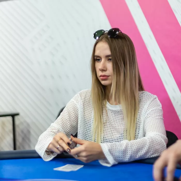 Дмитрий Гудзь (HJ) открылся 800, Андрей Петрущенко (BU) сыграл 3-бет 2,5к. Гудзь повысил ещё раз — 7,8к, Петрущенко — колл.