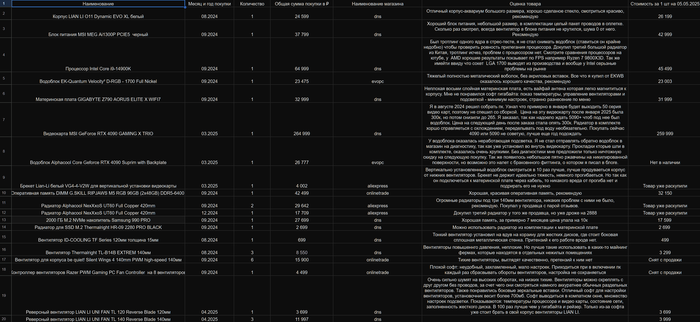 Да, я сделаю таблицу со всеми комплектующими: название комплектующего, дата покупки, название магазина, примерная текущая стоимость, насколько качественным оказался товар